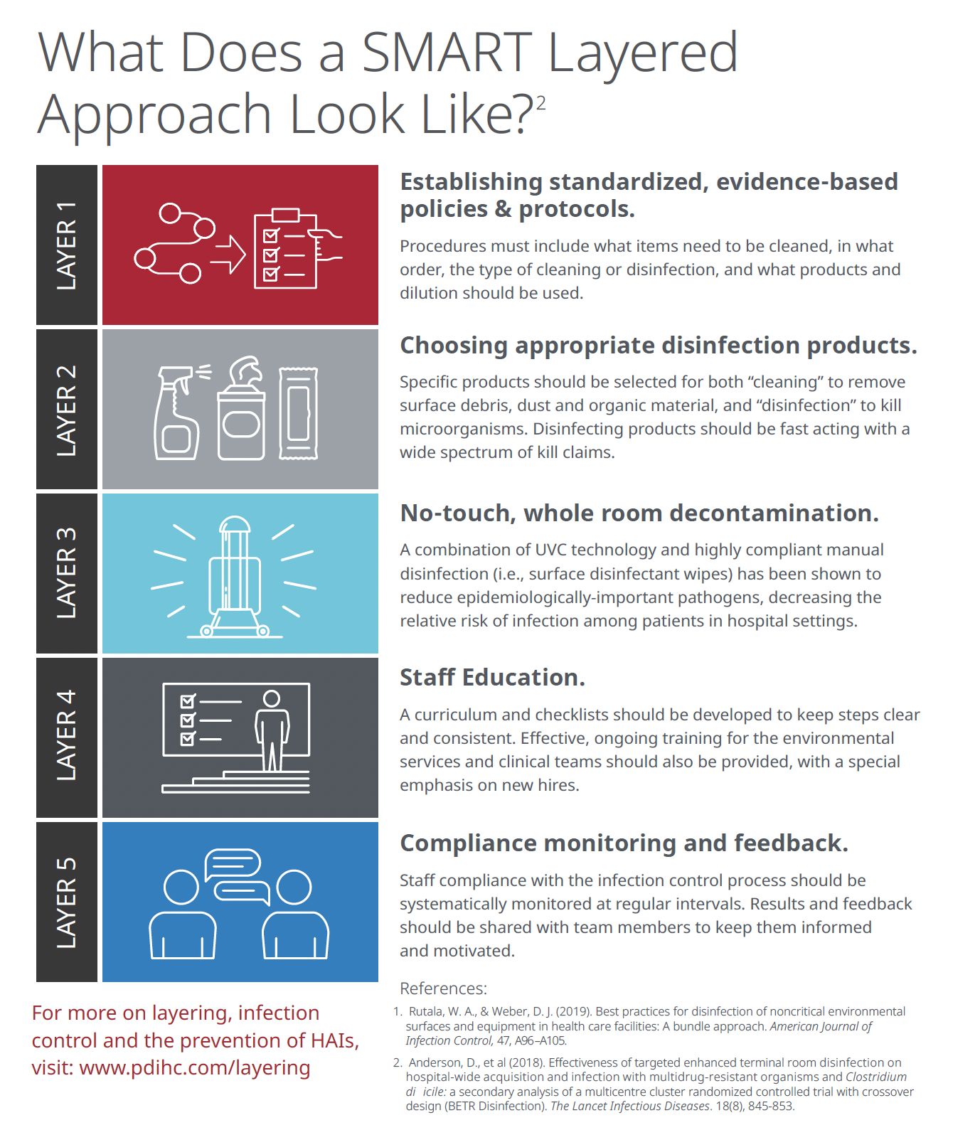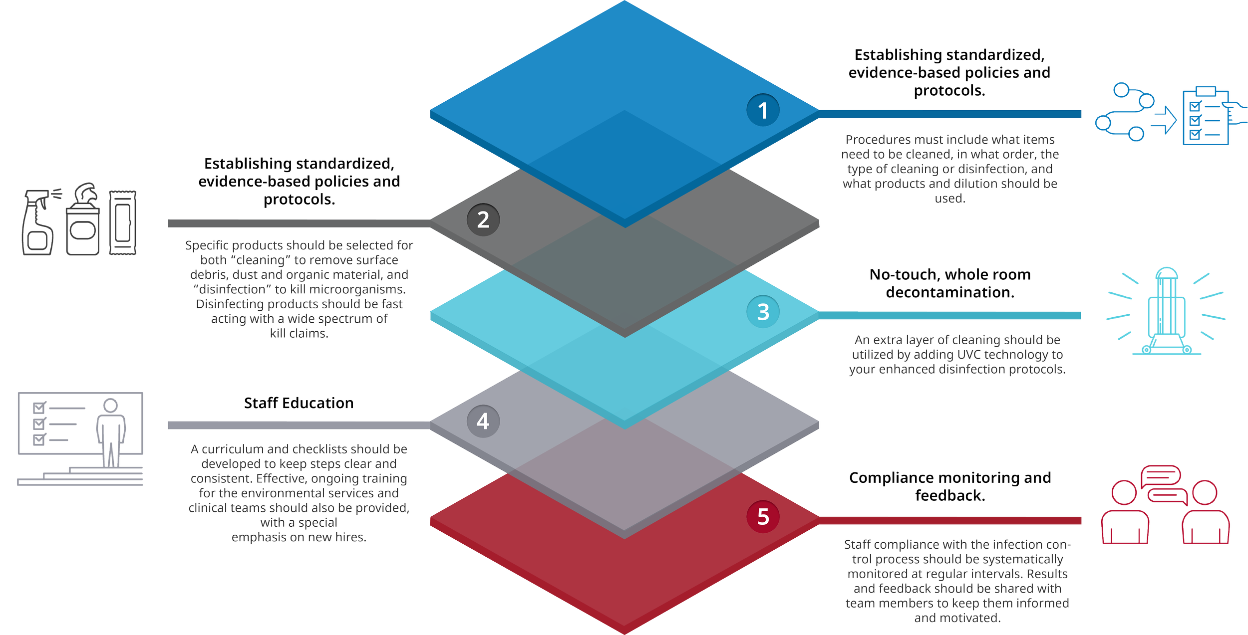 One particular requirement was to include a graphic displaying their Layered Approach which was a diagram depicting their ideology that: “Hospitals need multiple layers of defense to ensure the highest level of cleanliness because no single approach can completely eliminate microorganisms in the environment.”